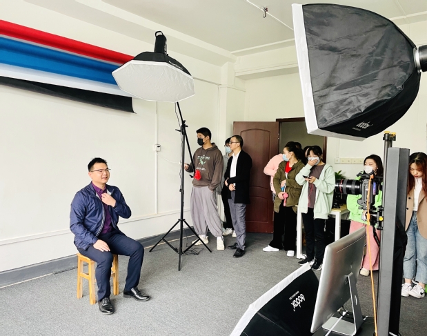 教师们跟随明耀争来到凌波楼五楼新建的实训室,一个小型摄影棚映入眼帘。“这是我们研发的自助拍摄系统,可以单人一键轻松搞定形象照片,还可以自由选择海报形象照、最美证件照、商务形象照和个人写真场景。”耀嘉影视团队指导学生实训的成员向老师们介绍道。