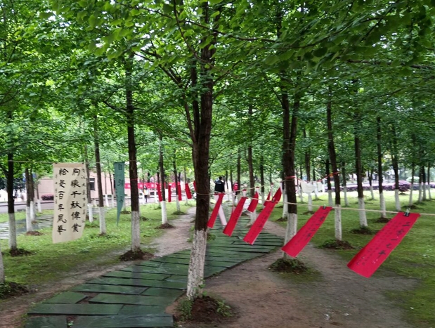 在银杏林展览现场,展出征集到的楷书、隶书、篆书、行书、草书等不同字体软硬笔书法作品数十幅,其内容包括《沁园春·雪》《沁园春·长沙》《七律长征》等毛泽东诗词,以及名言警句。书法协会指导老师、党委宣传部娄修明老师专门题写了本次展览主题和“盛世伟业”隶书作品一幅。