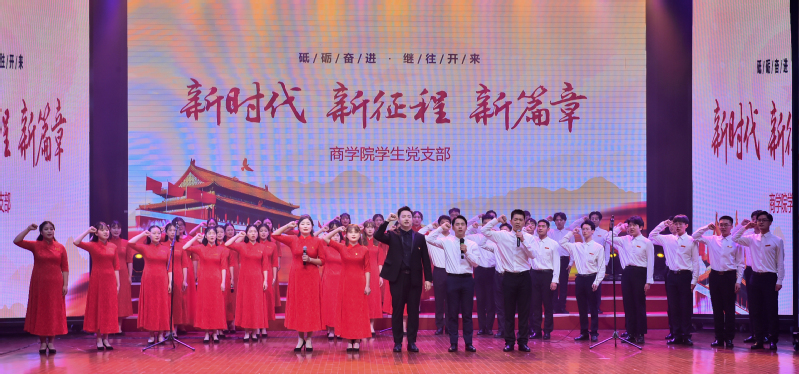 商学院学生党支部带来合唱《我爱你中国》,抒发青春学子强烈的民族自豪感和文化自信心。随后,5名党员师生领誓,带领大家重温入党誓词,传承红色基因,牢记初心使命。