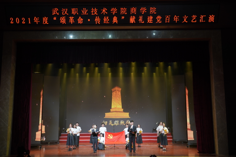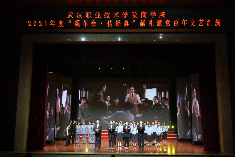 整场晚会以庆祝中国共产党成立100周年为主题,商学院师生以丰富的艺术形式和昂扬的精神风貌,呈现中国共产党百年来团结带领中国人民不懈奋斗的辉煌历程。商学院院长孟凡中、分党委书记张幼华、智能商务学院副院长周蓉、学生工作处副处长陶舒与千余名师生代表欢聚一堂,享受一场充满党史教育意义的红色盛宴。
