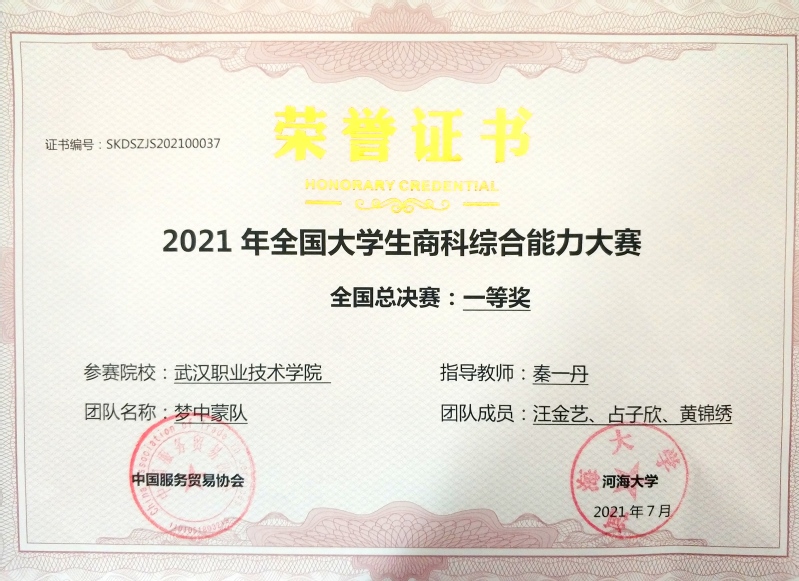 武职网讯(通讯员 秦一丹)近日,2021年全国大学生商科综合能力大赛全国总决赛圆满落幕。武汉职业技术学院2020级工商企业管理专业汪金艺、占子欣、黄锦绣三名学生,在全国高校队伍中成功突围,获得全国总决赛一等奖。