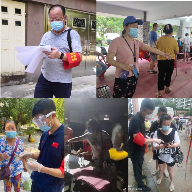 敖锋、柯松桥、沈易佳、郑丹、程文谦参与社区核酸检测现场管理,他们不惧蚊虫叮咬、坚守在岗,工作到凌晨才回家。陈家新、宋鸿翔、陈俞安等教师头顶烈日,参与社区门岗测量体温。