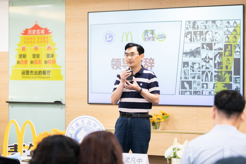 商学院院长孟凡中在仪式上致辞,对武汉金拱门食品有限公司在与学校协同育人中的支持与配合表示感谢,对学生们在岗位中的快速成长表示热烈祝贺。他强调,职业教育与普通教育是两种不同的教育类型,要坚守职业教育初心、致力服务地方经济和社会需求。