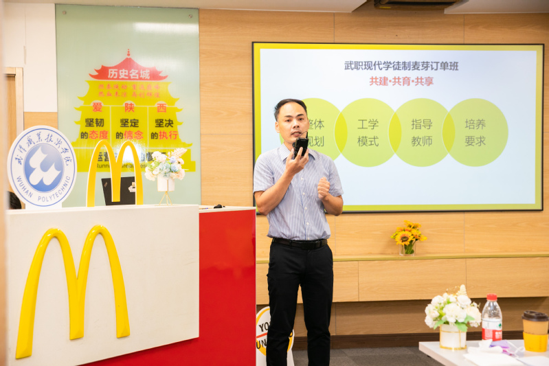 武汉金拱门食品有限公司总经理杜延松在致辞中介绍,自2021年3月起,公司与武汉职业技术学院合作开展现代学徒制合作项目,校企双方探讨设计现代学徒制培养模式,精心安排学生顶岗实习场地,全面打造“师带徒”和线上培训及学习体系,构建良好的沟通与协作机制。合作以来,学生们在岗位上表现优异,“麦芽订单班”项目已成为公司校企合作示范项目。本期“麦芽订单班”学徒将参加为期一年半的工学交替学徒制培养,综合表现优异者毕业后可成长为麦当劳餐厅总经理。