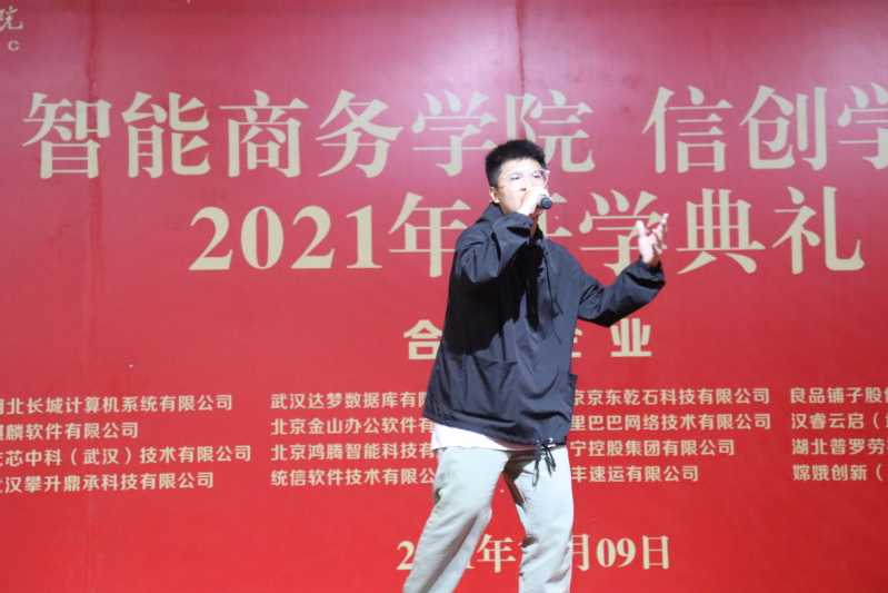 电商21302班冯展辉演唱歌曲《not my wrong》,他声音浑厚,一袭黑衣酷炫登台,神情专注,歌声悠扬。电商类21302班杨瑞琪、温子豪经典说唱《red lips》,优美的旋律,华彩的前奏,深深抓住学子们的心。两首歌曲点燃全场的热情,引来台下掌声不断。