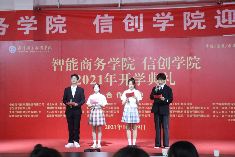 武职网讯(通讯员 侯中熙 许俊杰 摄影 汪颖龙 胡馨悦)流光溢彩迎新夜,心心连新齐飞扬。10月9日,智能商务学院、信创学院教师代表与810余名新生欢聚光谷东校区教学楼,顺利举行“活力武职,歌舞青春”迎新晚会。