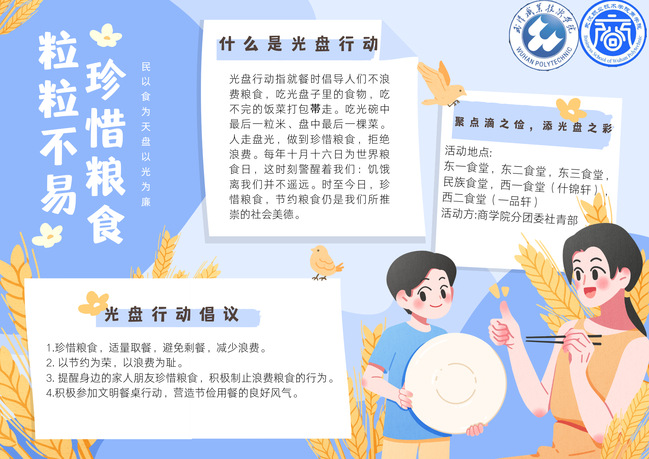 10月24日,商学院分团委组织开展“光盘行动,我们在作战”志愿服务活动,通过宣传视频、志愿劝导等方式,营造“浪费可耻、节约光荣”的就餐氛围,号召武职人摒陋习、树新风,争做节约粮食的践行者、餐桌文明的示范者、拒绝餐饮浪费的宣传者。