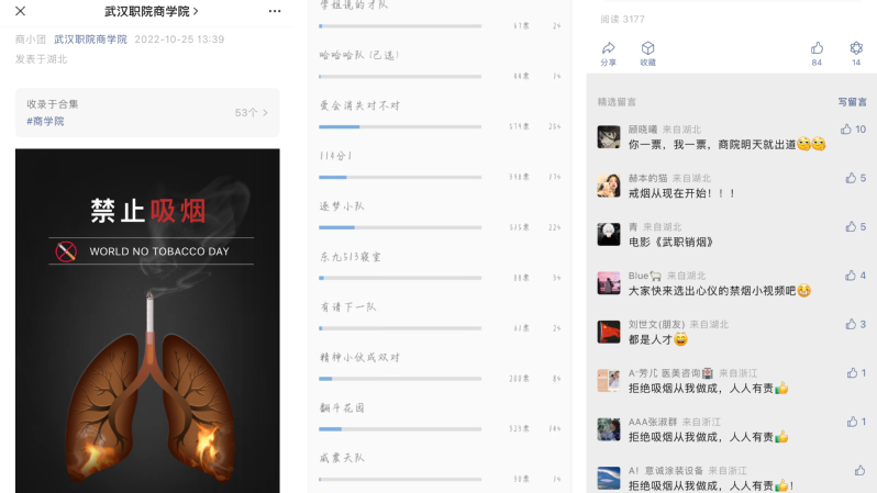 本次“禁烟有我在行动”的主题活动以拍摄小视频的方式展开,共收到禁烟小视频53个。经初审,选出10个优秀禁烟视频在“武汉职院商学院”微信公众号上进行投票、展播,最终财会类22305班杨卫、王静怡等六名学子斩获一等奖,会计22201班张文仪等七荣获二等奖;营销22201班张亚芬等七人获得三等奖。本次共有2300余人参与投票,3100余人关注,有效拓宽了禁烟宣传覆盖面。