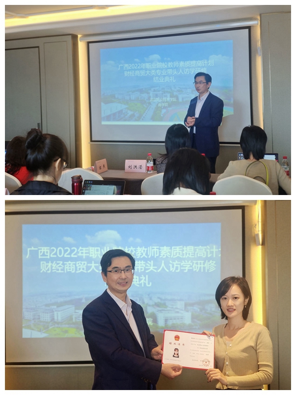武职网讯(通讯员 陶琳 沈易佳 摄影 苏琴)11月6日,由武汉职业技术学院商学院承办的广西2022年“职业院校教师素质提高计划”财经商贸大类专业带头人访学研修项目圆满收官。此次培训从10月24日启动,来自广西壮族自治区23所职业院校的24名财经商贸大类专业带头人参加了为期14天的培训。