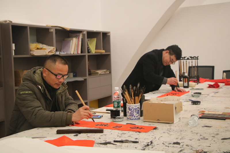 随后,娄修明、邹先祥两位教师示范挥毫。娄修明用楷、行、隶等书体写下多副新春联语,笔力遒劲、章法严谨;邹先祥则结合艺术设计专业的审美理念,一边示范一边细致讲解春联创作的结构布局、笔墨运用等技巧,让大家受益匪浅。